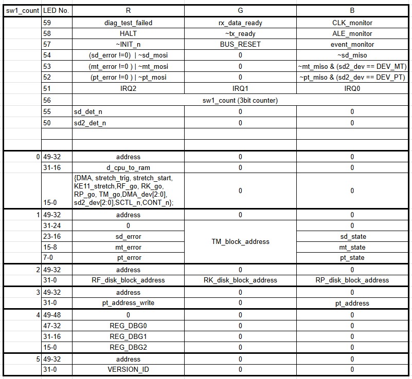 このデバック情報の表示はTangConsoleボードのSW1を押すことで内容を切り替えて表示する仕様です。最初のLED 40個バージョンでは8種類の内容を切り替えて表示していました。この切り替える手間をへらすために、できるだけ詰め込んで表示できるように見直してみました。具体的には以下の表のようになりました。
