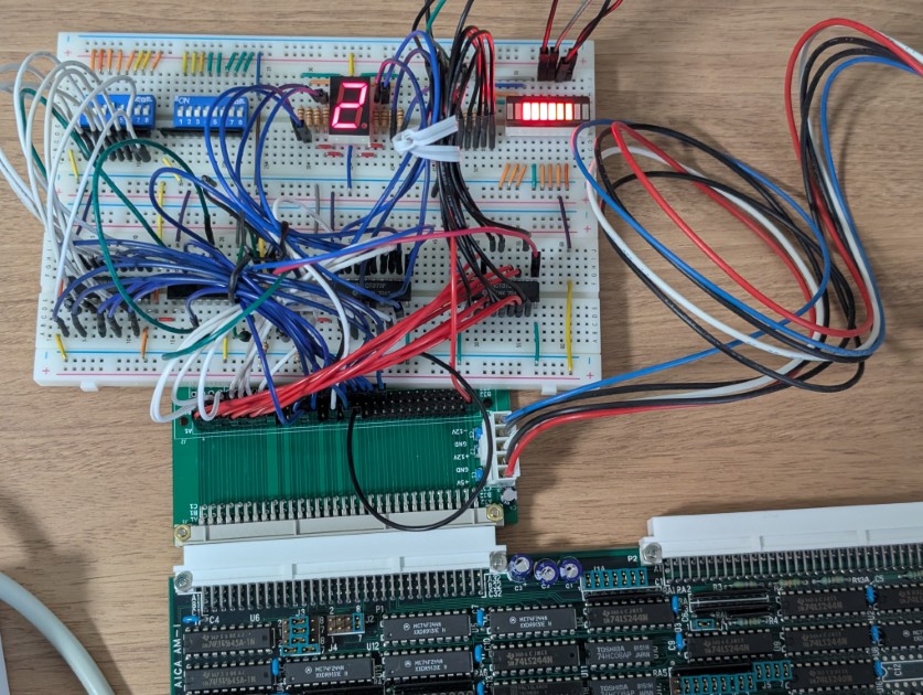 早速このブログに掲載されているLED表示回路を参考にして製作してみました。記事の回路に近いものを手持ちのパーツで製作してみたのですが、私のVMEボードでは正しく動きませんでした。